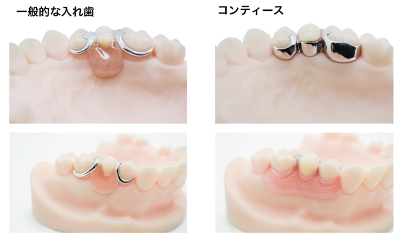 コンティースは、取り外しが可能な義歯の一種で、審美性や装着感に配慮された入れ歯です。従来の部分入れ歯と比べ、自然な見た目や違和感の少なさが期待できる設計とされています。